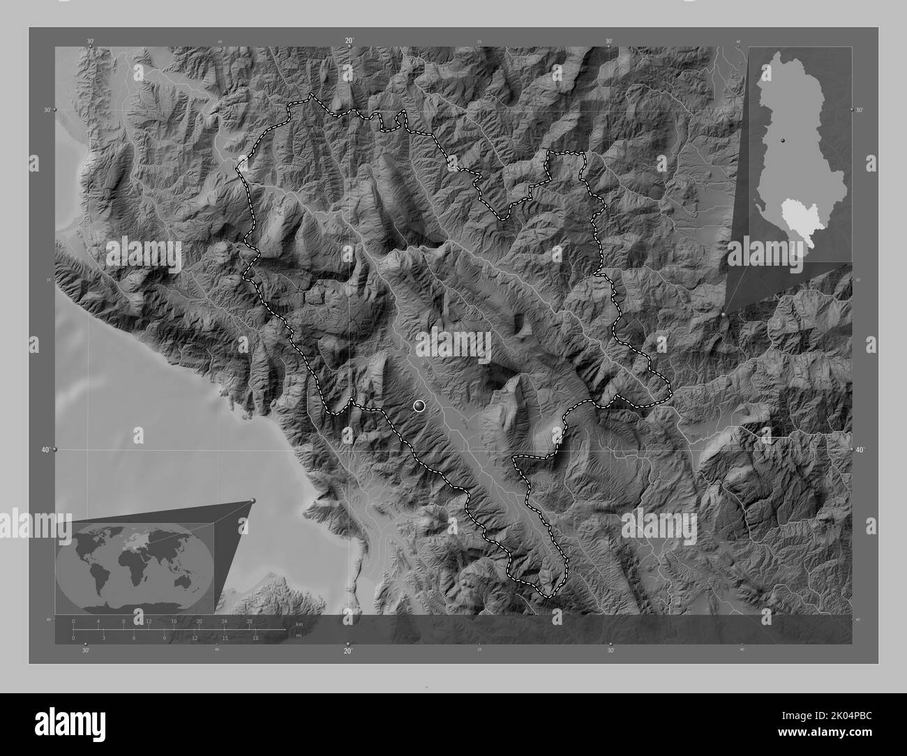 Gjirokaster, county of Albania. Grayscale elevation map with lakes